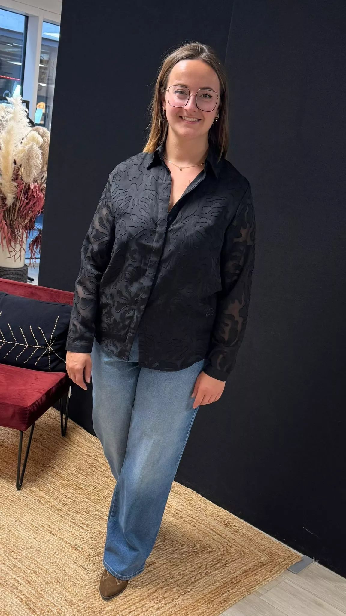 Die Bluse Sacha überzeugt durch ihren eleganten Dévoré-Stoff. Ärmel und Rücken zeigen ein dezentes Spiel mit Transparenz, während die Vorderseite vollständig gefüttert ist und für optimale Opazität sorgt. Der klassische Hemdkragen und der gerade Schnitt machen dieses Modell vielseitig kombinierbar – sowohl für einen eleganten als auch für einen lässigeren Look.