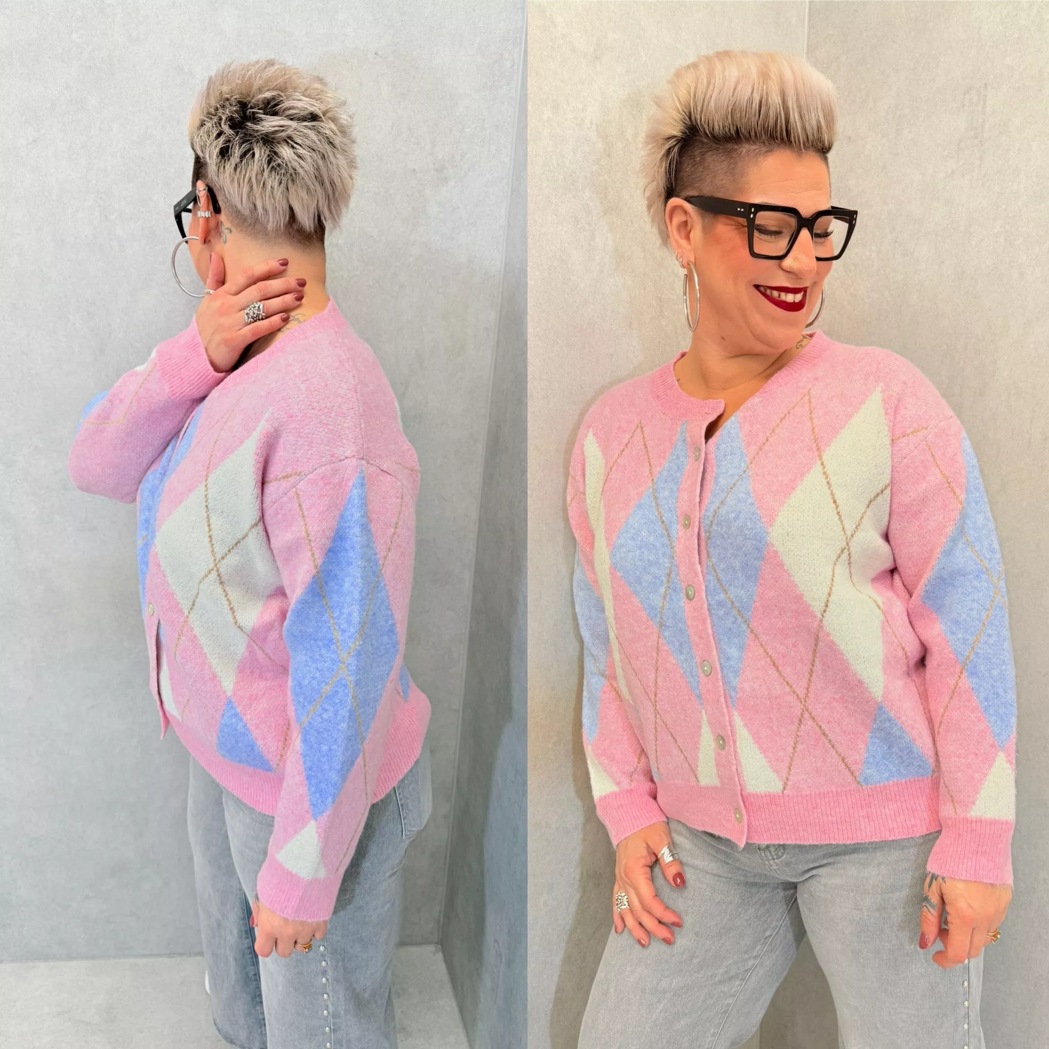 Die Strickjacke überzeugt durch ihr Jacquard-Muster mit Rauten und harmonischen Farbkombinationen. Die Knopfleiste ermöglicht verschiedene Tragevarianten. Der Schnitt ist auf große Größen ausgelegt und bietet angenehme Weite im Brustbereich.