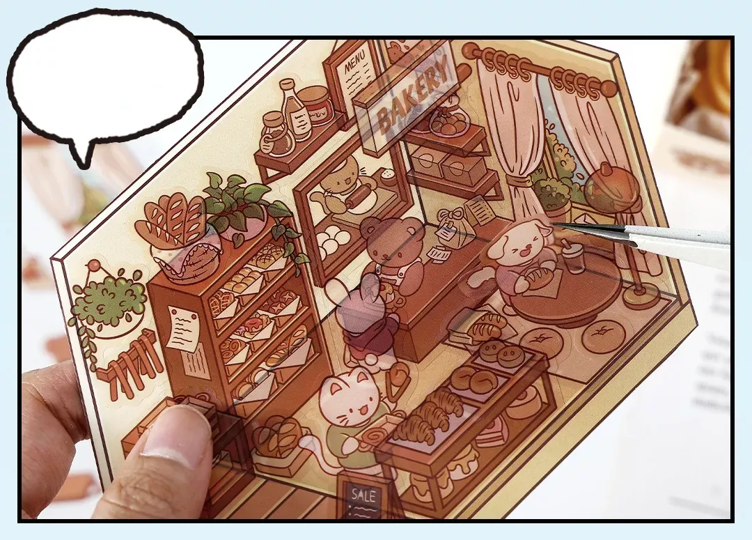 Gestalten Sie die 3D-Szene „Bakery Brown“ mit Cozy Stickers auf einer gedruckten Szenenkarte. Dieses kreative Set ist in erster Linie für Erwachsene konzipiert und ermöglicht es, eine detailreiche Miniatur-Bäckerei aufzubauen.