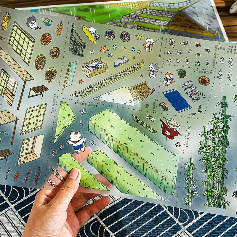 Die Szene wird schrittweise aufgebaut: Eine Hintergrundkarte bildet die Basis, die PET-Sticker ergänzen die Details, und eine transparente PET-Abdeckfolie sorgt für ein sauberes, strukturiertes Endergebnis. Ideal für alle, die kreative Ruhe und visuelle Ordnung schätzen.