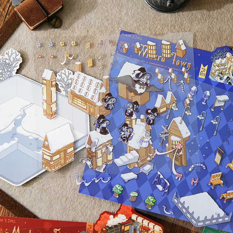 Gestalten Sie die 3D-Szene „Winzard Town“ mit Cozy Stickers auf einer gedruckten Szenenkarte. Dieses kreative Set ist in erster Linie für Erwachsene konzipiert und ermöglicht es, ein winterliches Fantasie-Dorf Schritt für Schritt aufzubauen.