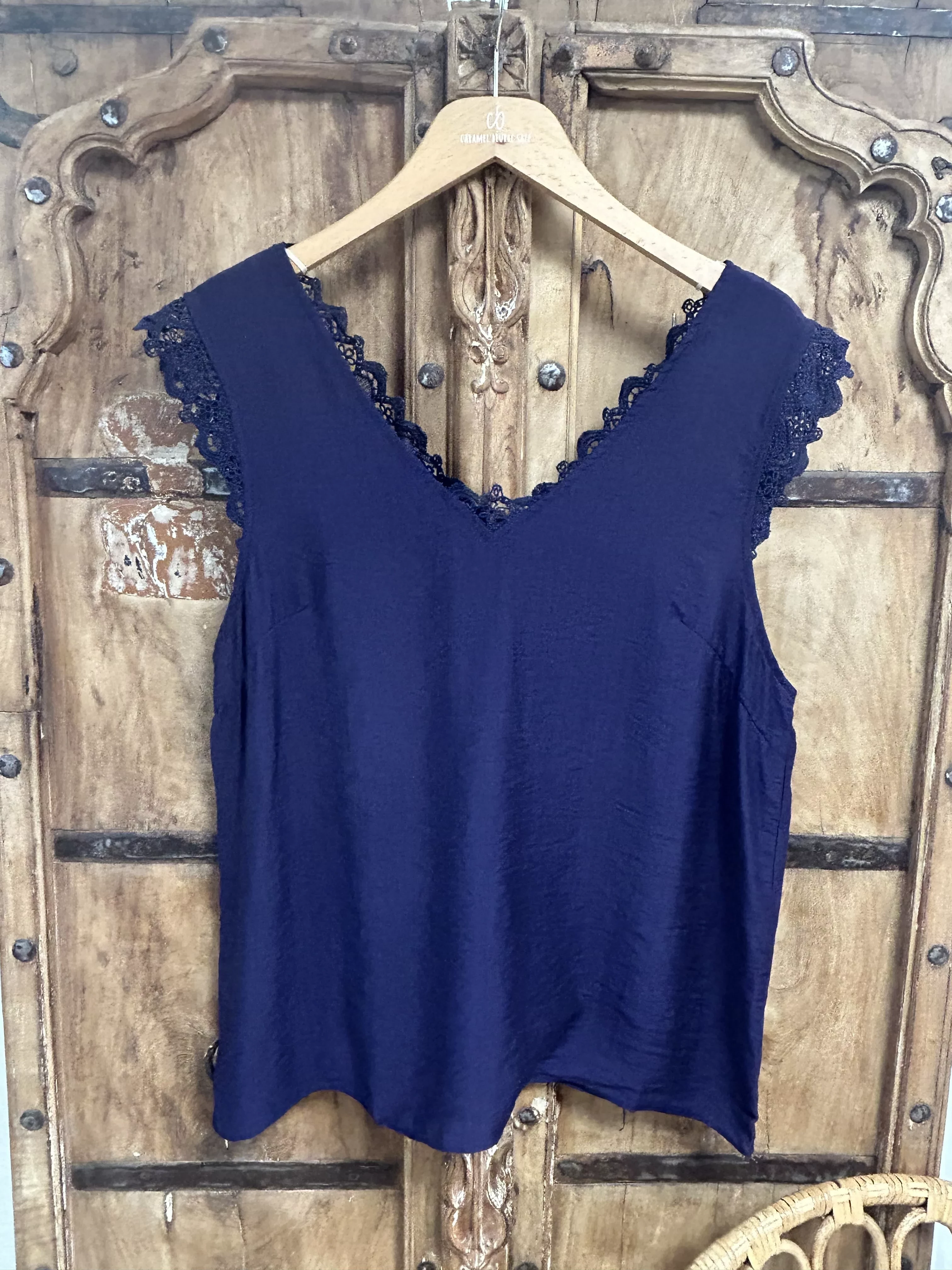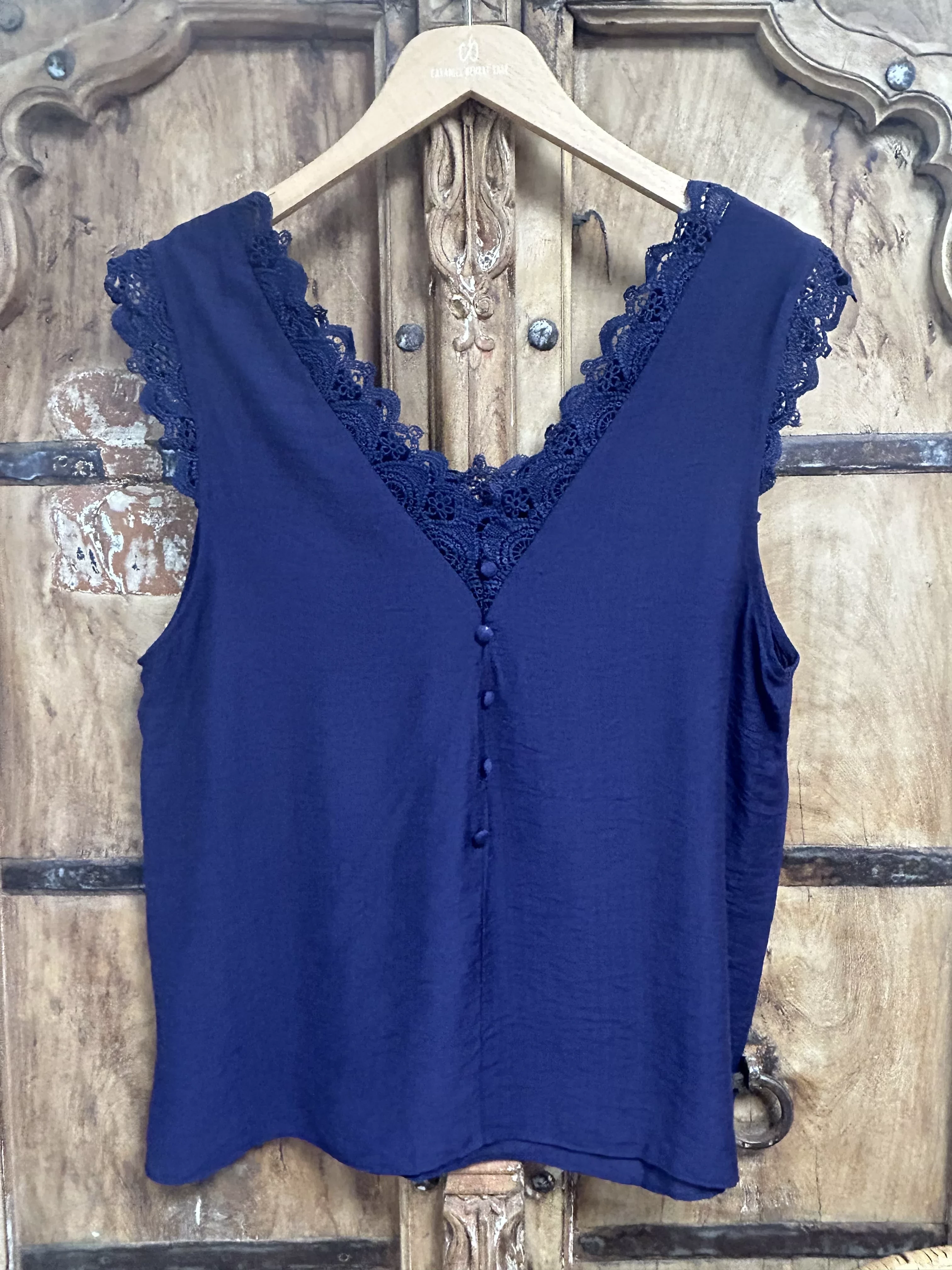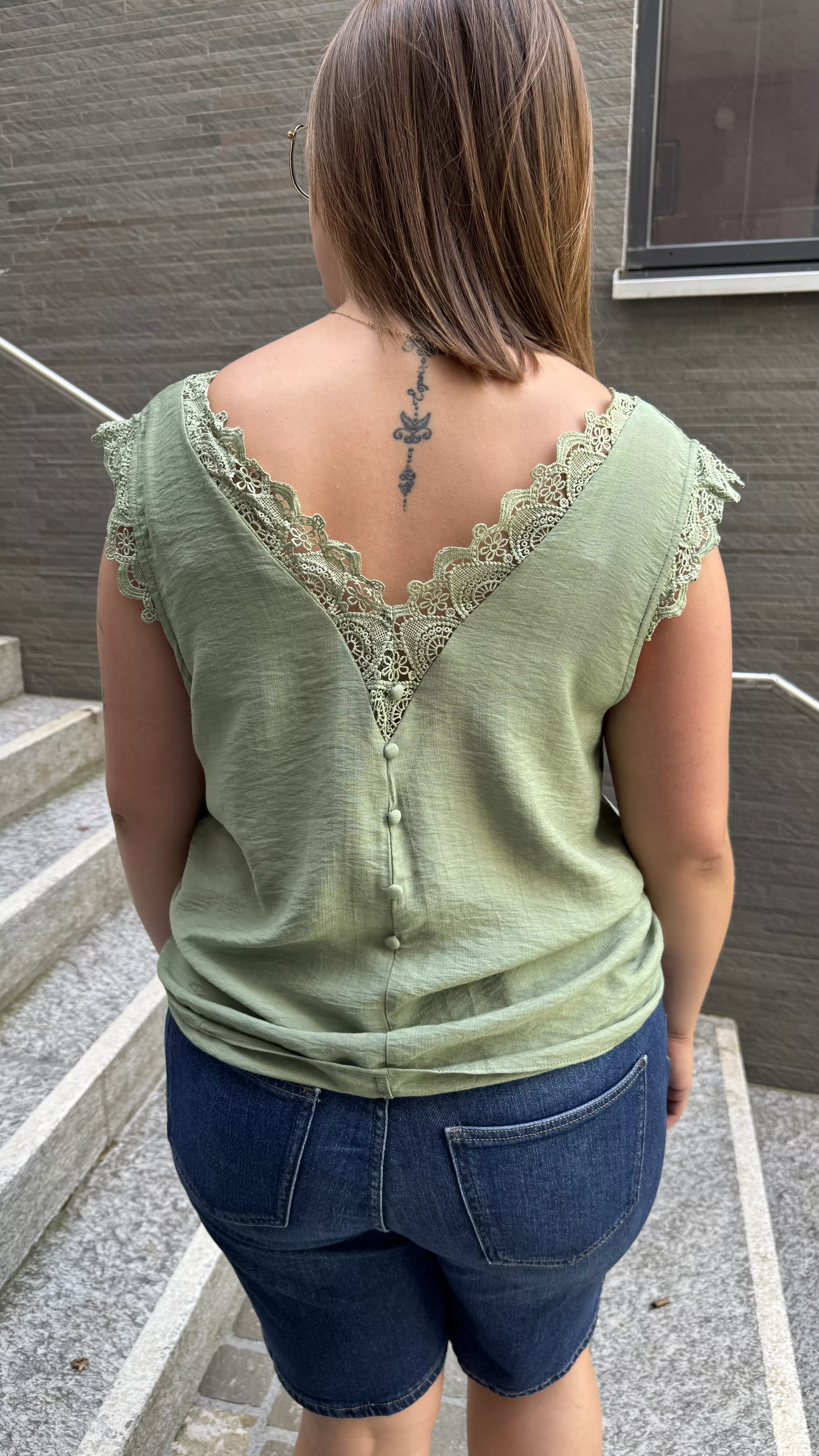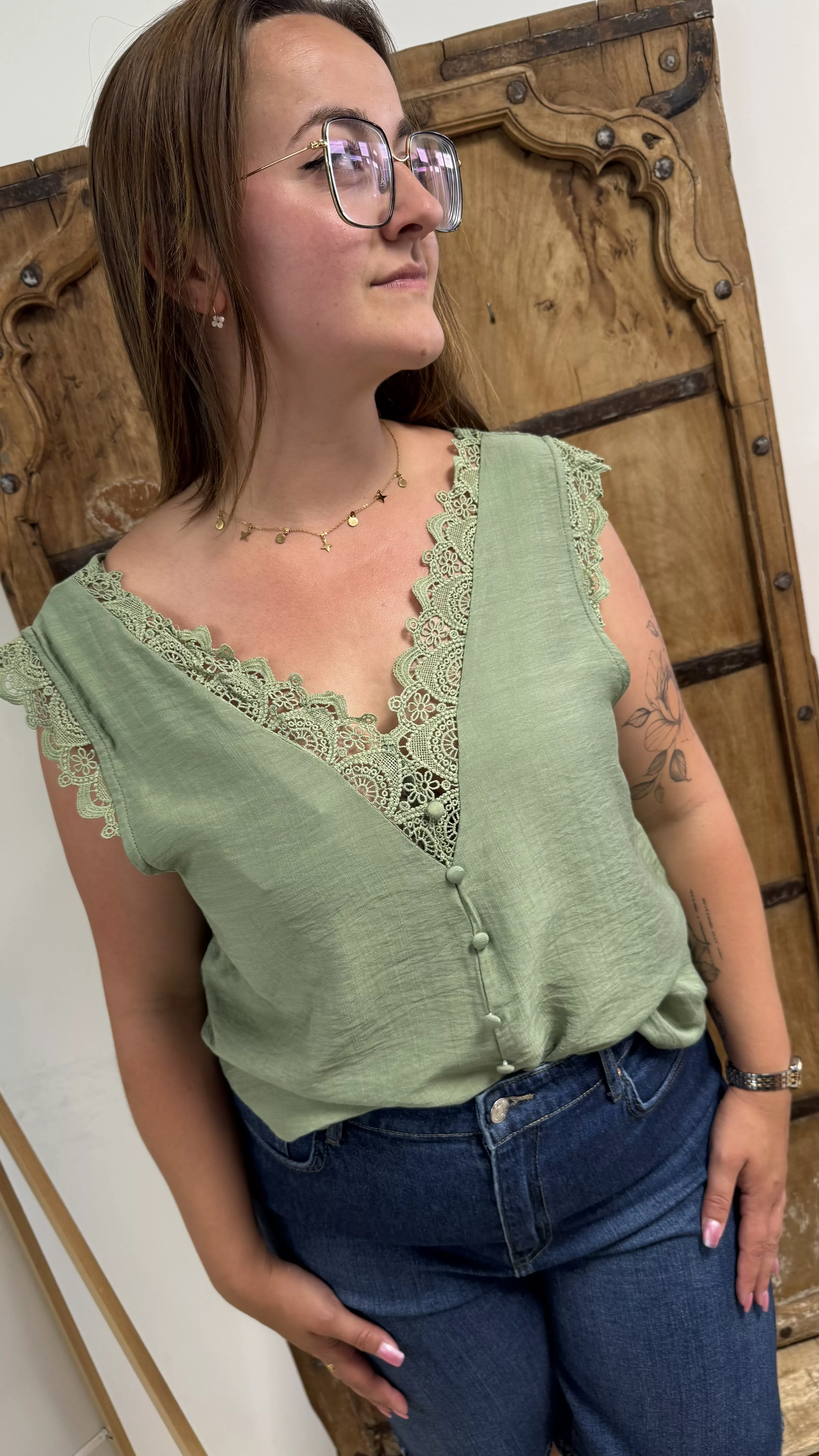 Das Top Katia der Marke Maëlle verführt mit feinen Details: zarte Stickerei auf den Schultern und am Rücken, ein femininer V-Ausschnitt vorne und hinten sowie dekorative Knöpfe im Rückenteil. Und das Beste: