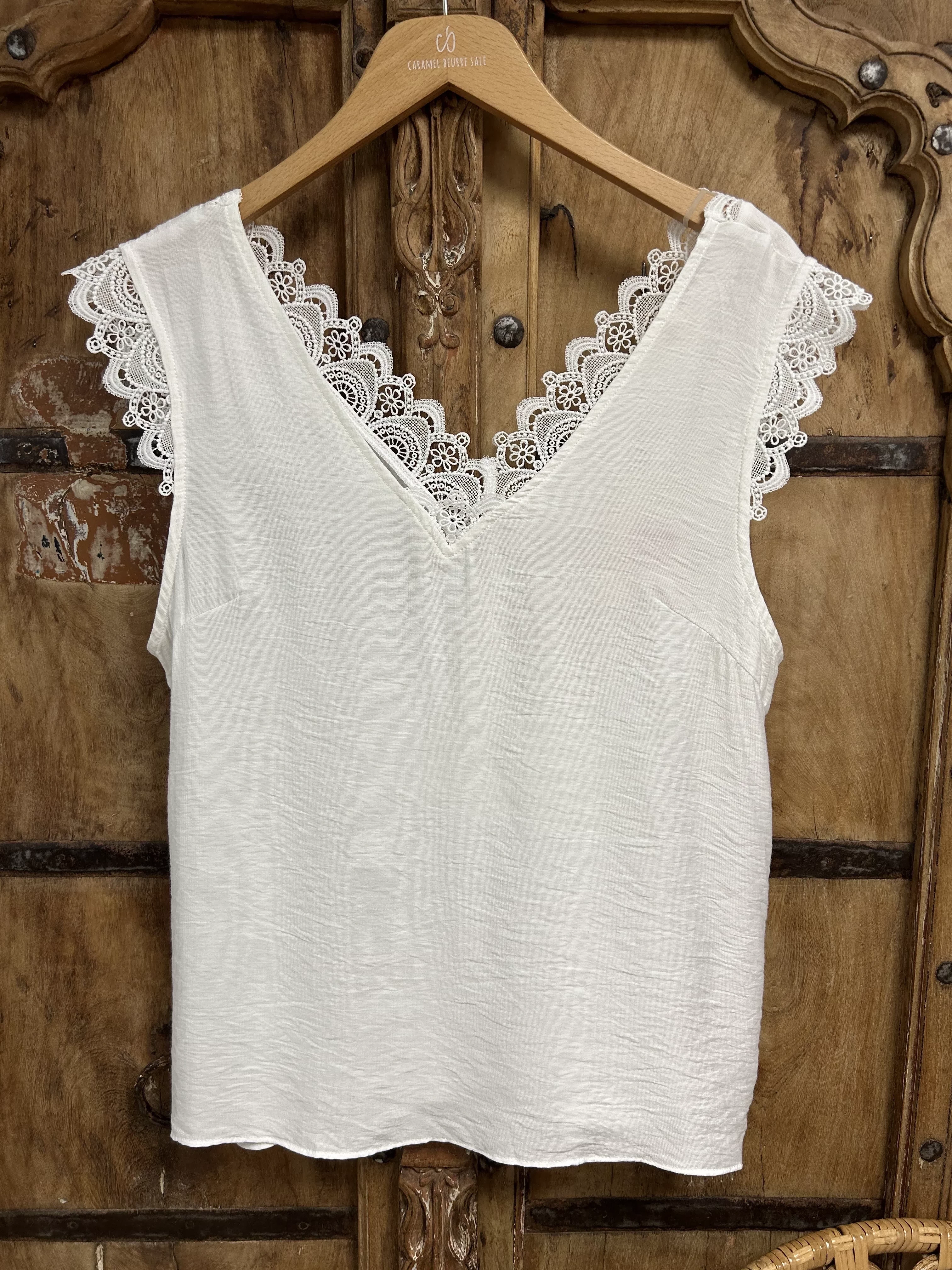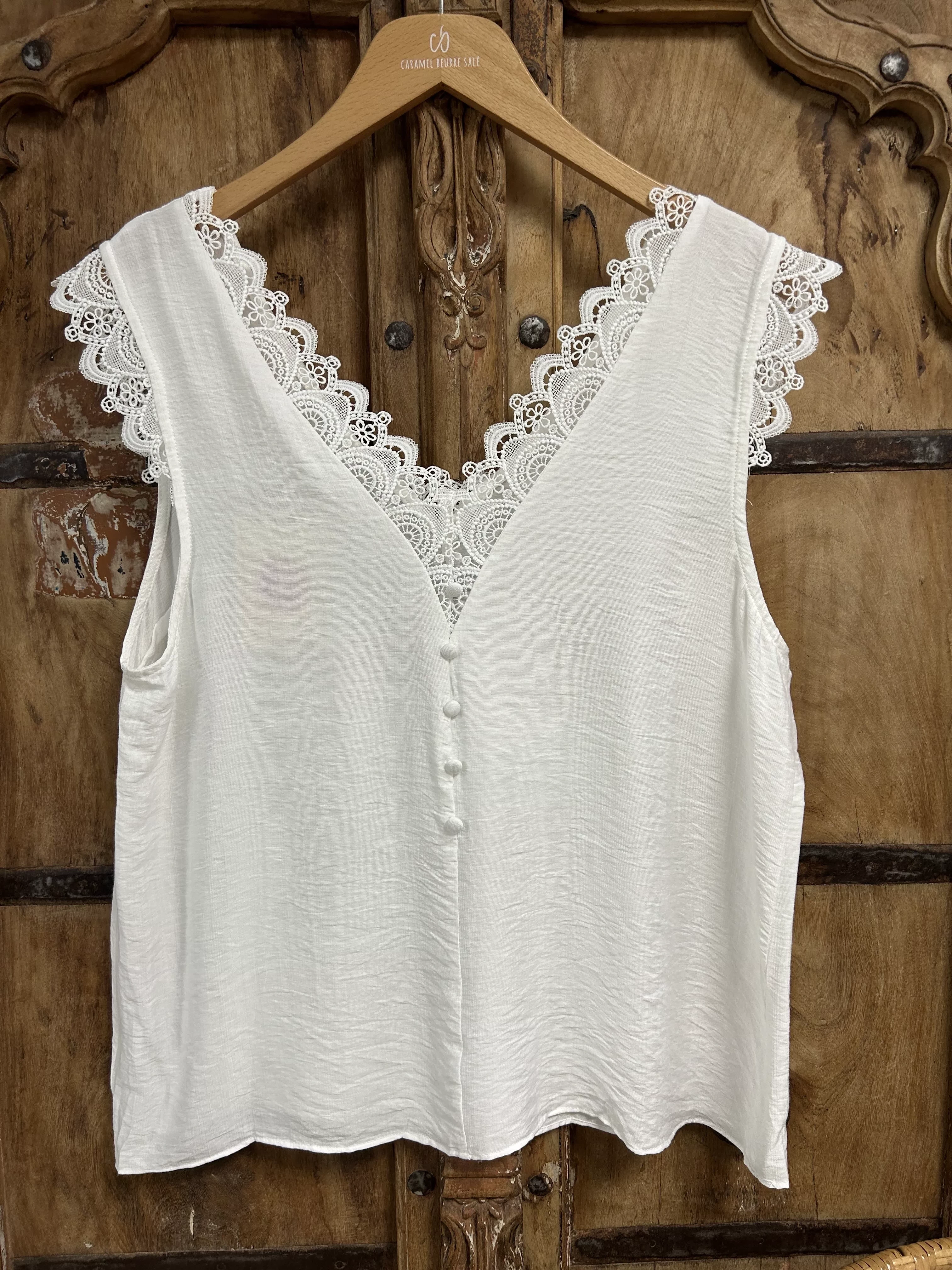 Un top qui attire les compliments à chaque mouvement ! Le modèle Katia, signé Maëlle, séduit par son jeu de matières fluide et sa délicate broderie sur les épaules et dans le dos. Le col V à l’avant comme à l’arrière sublime la silhouette, tandis que le faux boutonnage au dos apporte une touche raffinée… ou un détail original à l’avant !