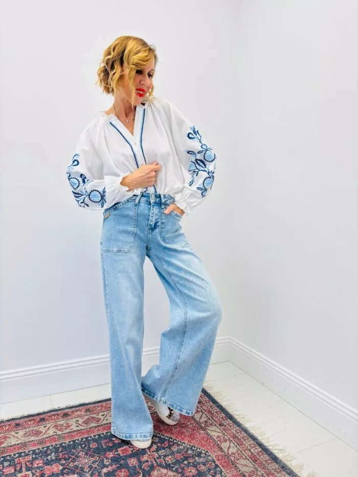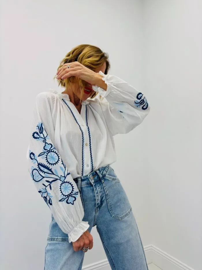 La chemise Vicky de Season s’inscrit dans un esprit bohème travaillé, porté par un coton léger et des broderies contrastées. Le col est délicatement ouvert, avec une finition brodée qui structure le haut du buste. La coupe est souple, avec un volume légèrement blousant et des manches longues ornées de broderies florales. Les poignets sont élastiqués, apportant confort et tenue.