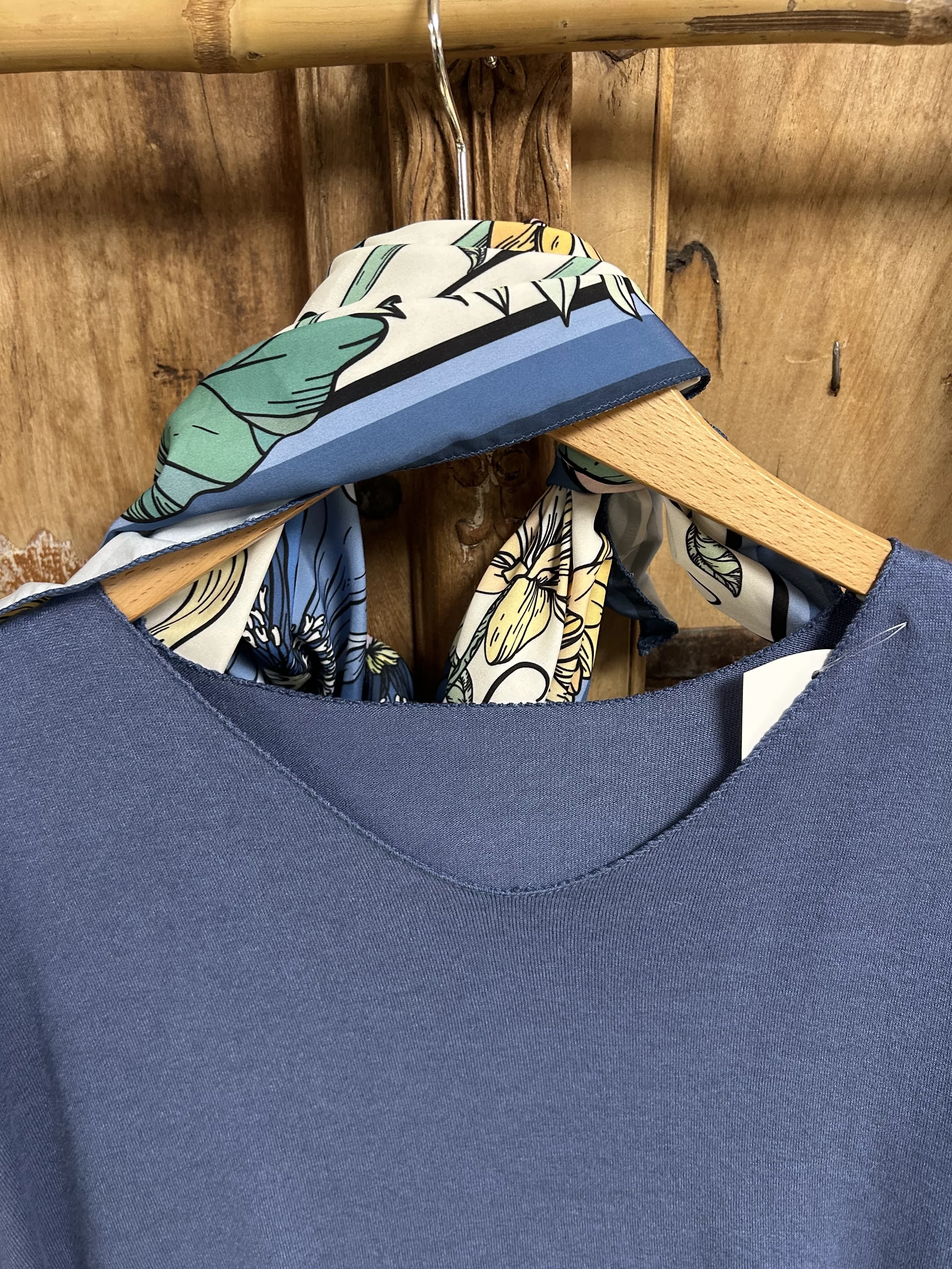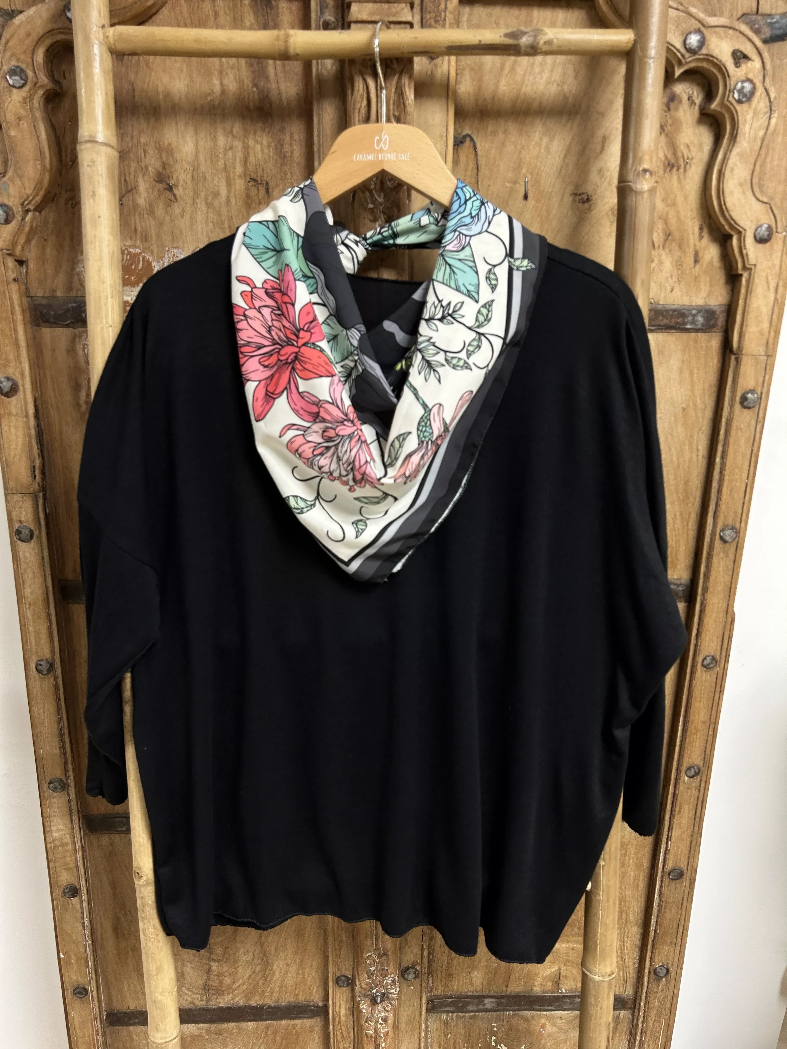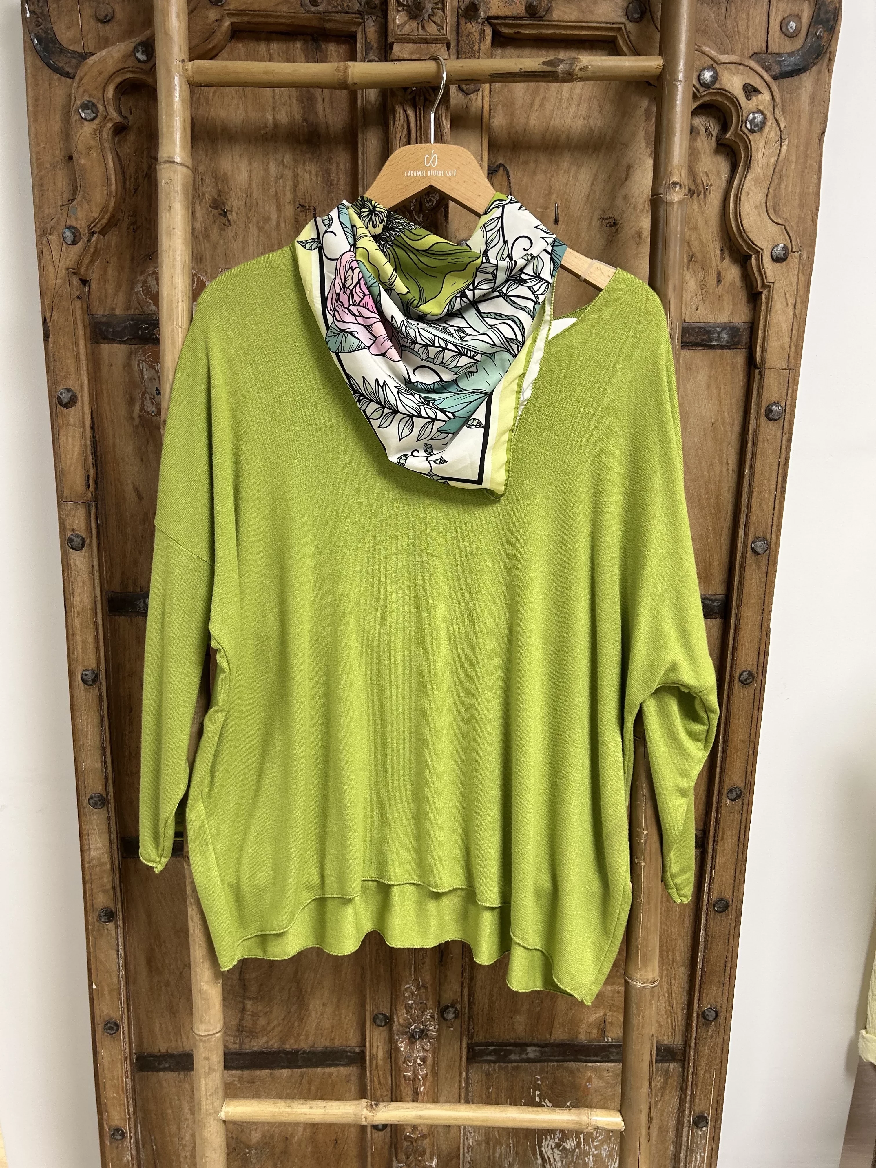 Ce pull en maille fine se distingue par son col V, qui structure le haut du buste et permet une mise en place naturelle du carré assorti. La coupe est souple et équilibrée, idéale pour un porté quotidien. Le carré coordonné complète la tenue sans alourdir l’ensemble et peut se porter de différentes façons.