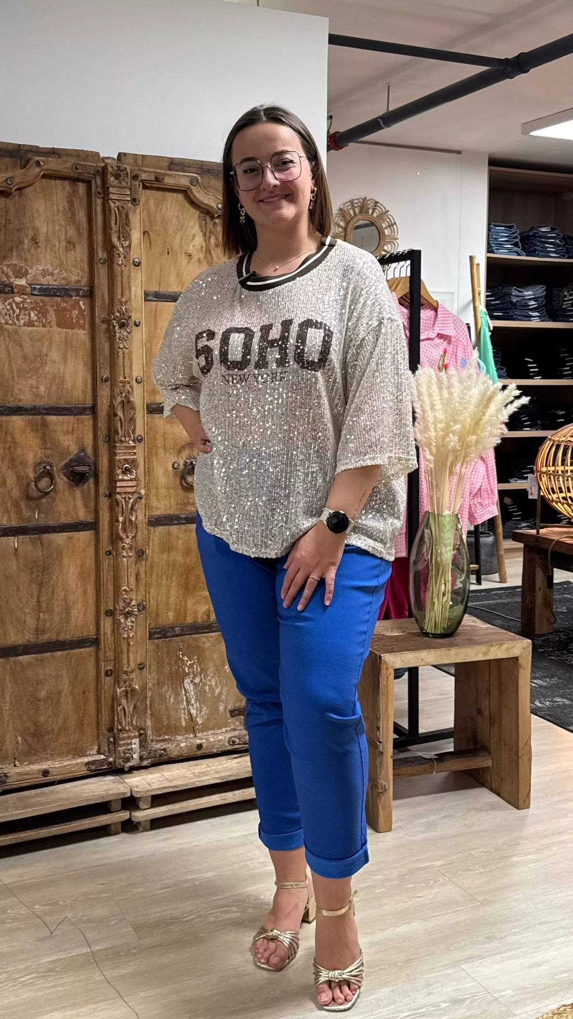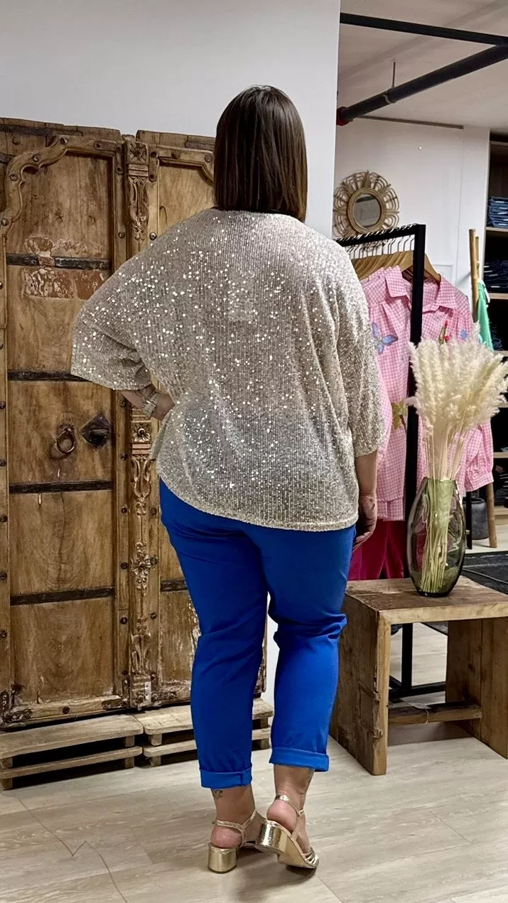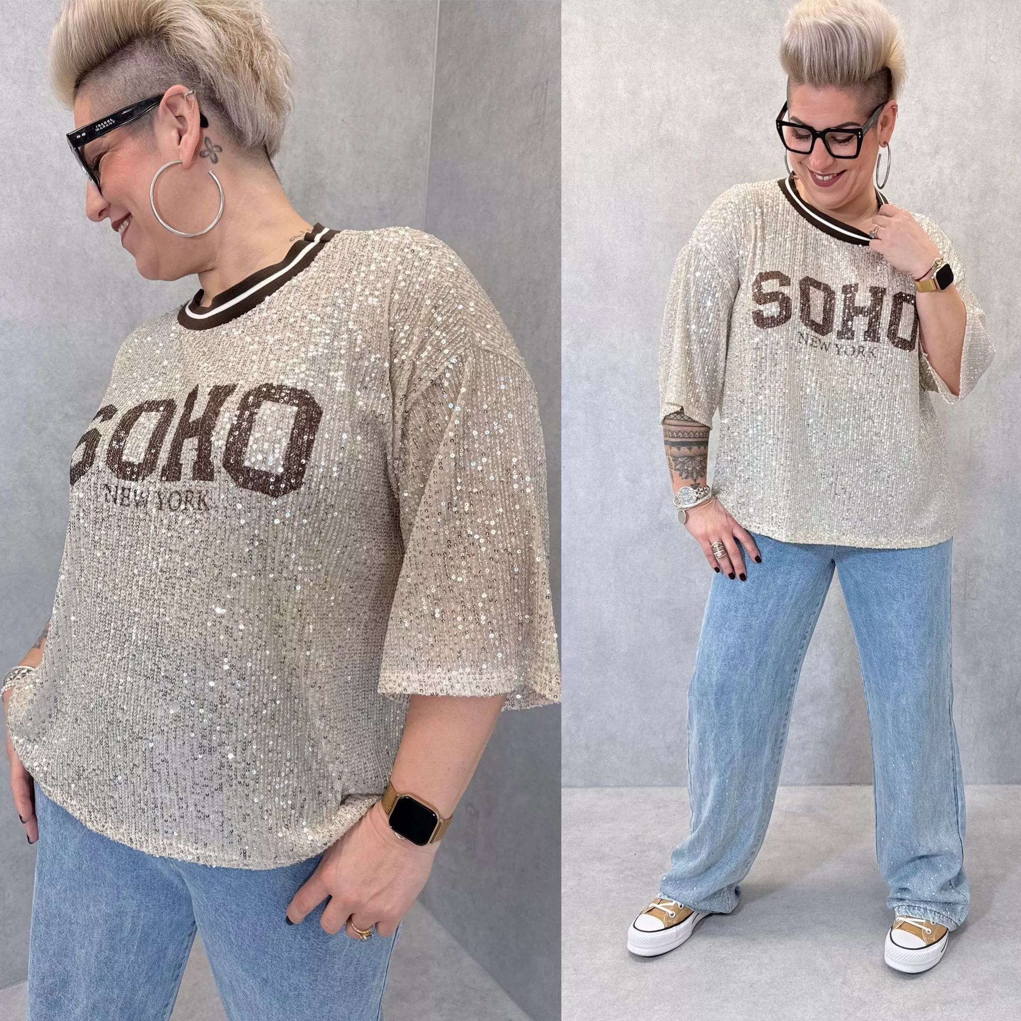 Ce T-shirt Soho en grande taille est une pièce lumineuse et originale à découvrir dans notre concept store à Lausanne. Recouvert de sequins discrets et brillants, il capte la lumière tout en restant facile à porter au quotidien.