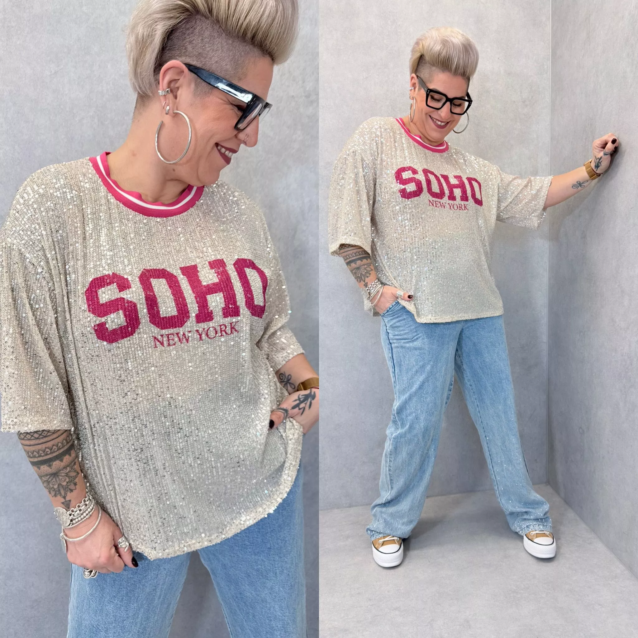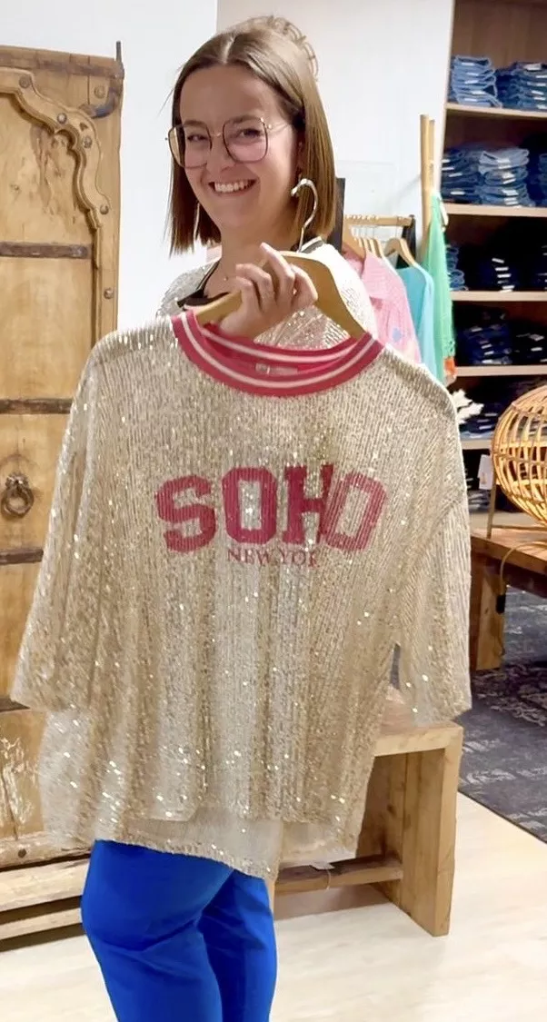 Le motif « SOHO New York » en lettres roses apporte une touche graphique et urbaine qui contraste joliment avec la base scintillante du tissu. L’encolure est soulignée par une bordure rose qui rappelle la couleur de l’inscription et apporte une finition nette et moderne.