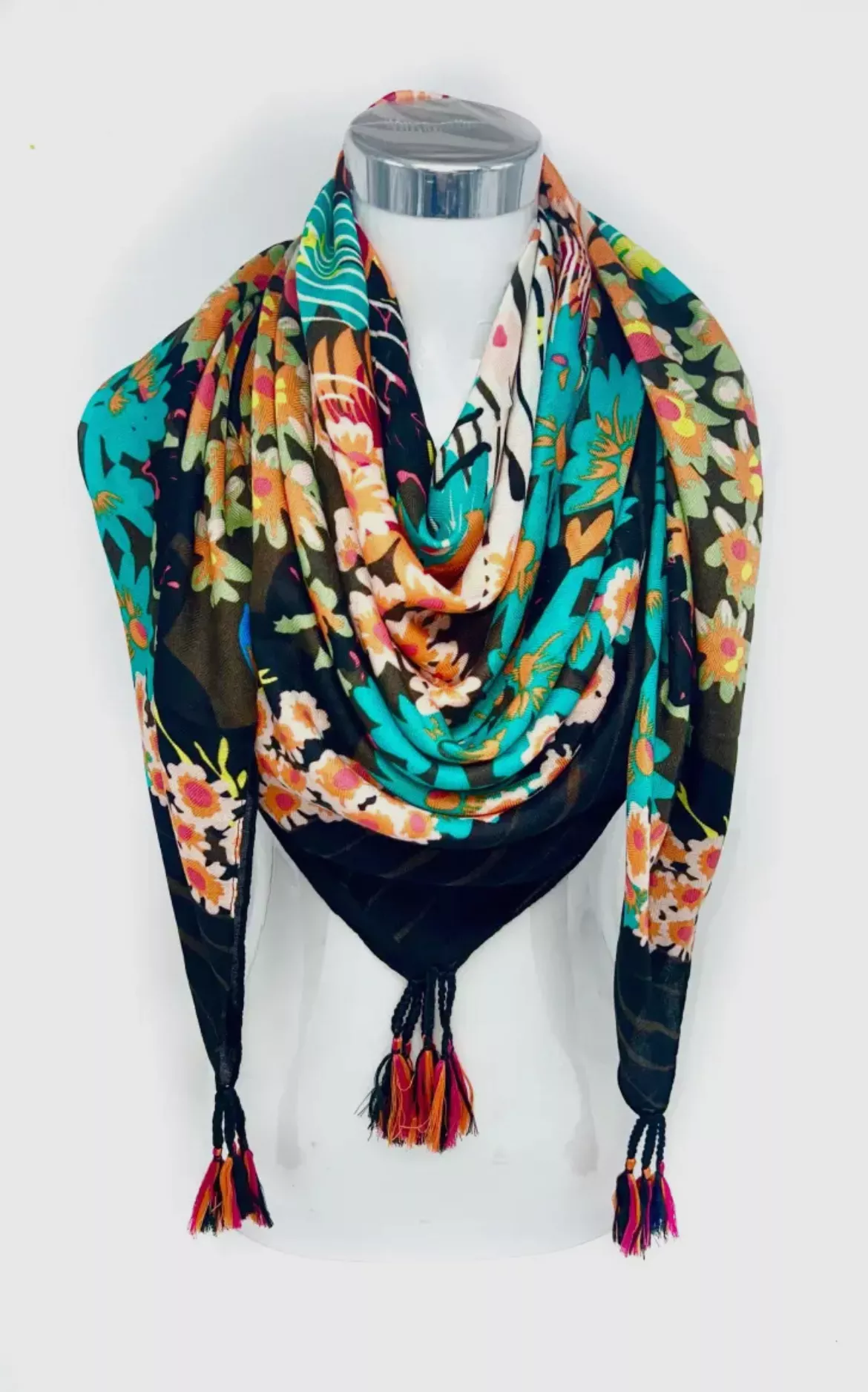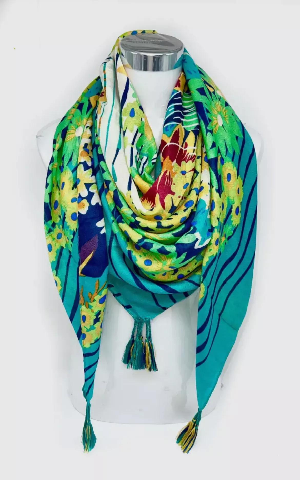 Ein farbenfrohes, leuchtendes Tuch, das jedem Outfit sofort Frische verleiht. Dank seines großen quadratischen Formats lässt es sich vielseitig tragen – als Dreieck, locker um den Hals gebunden oder über die Schultern gelegt. Die geflochtenen Quasten an den Ecken sorgen für einen handgefertigten, leicht verspielten Look.