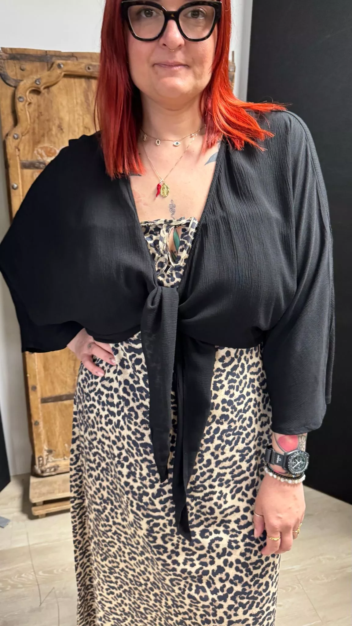 Disponible du 42 au 54, coupe ample avec lien à nouer sur le devant.