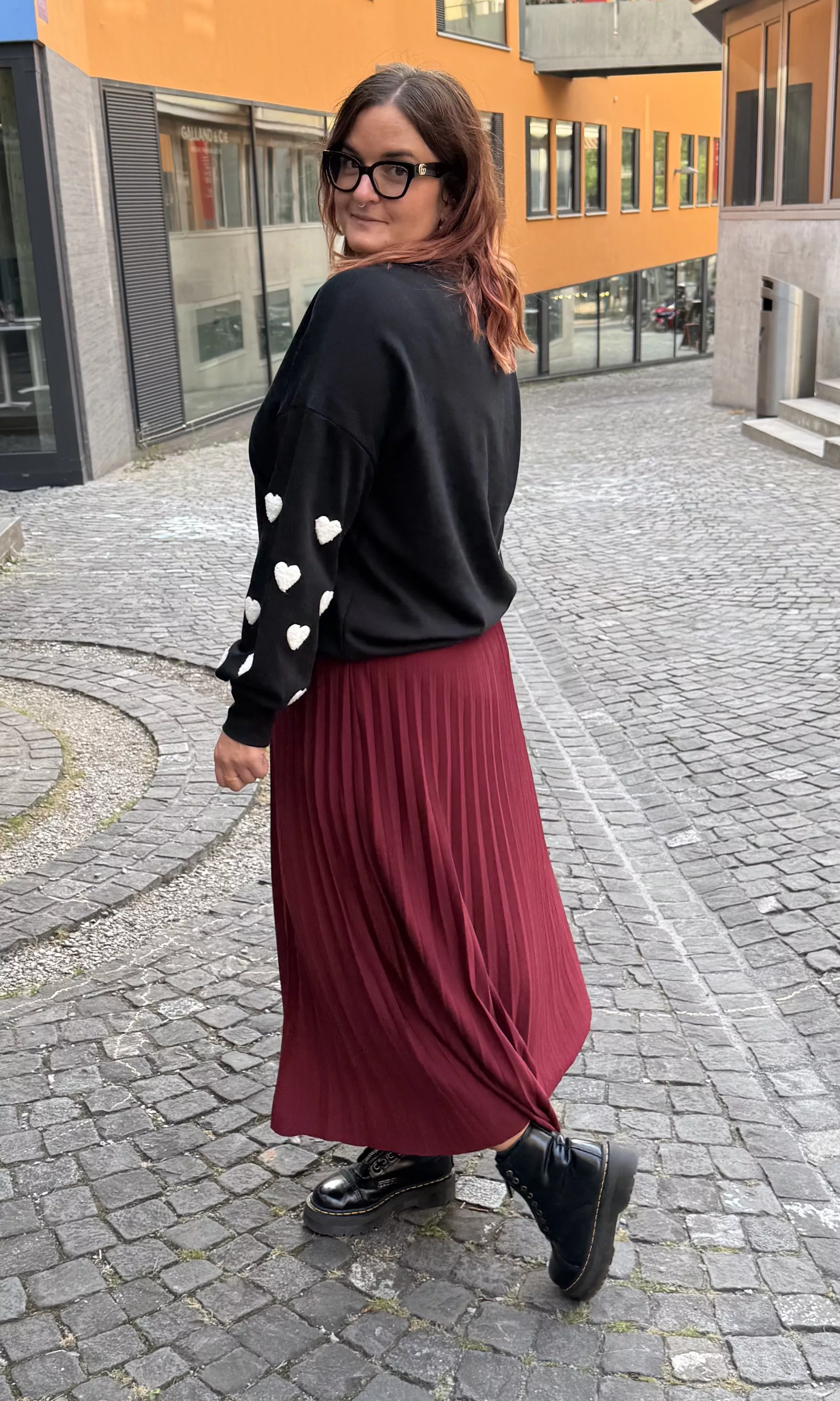 Der Plisseerock Enora überzeugt mit seiner fließenden Form und seiner femininen Ausstrahlung. Die lange, plissierte Silhouette sorgt für Leichtigkeit und Bewegung, während die tiefe Bordeauxfarbe jedem Outfit einen modernen Akzent verleiht.
