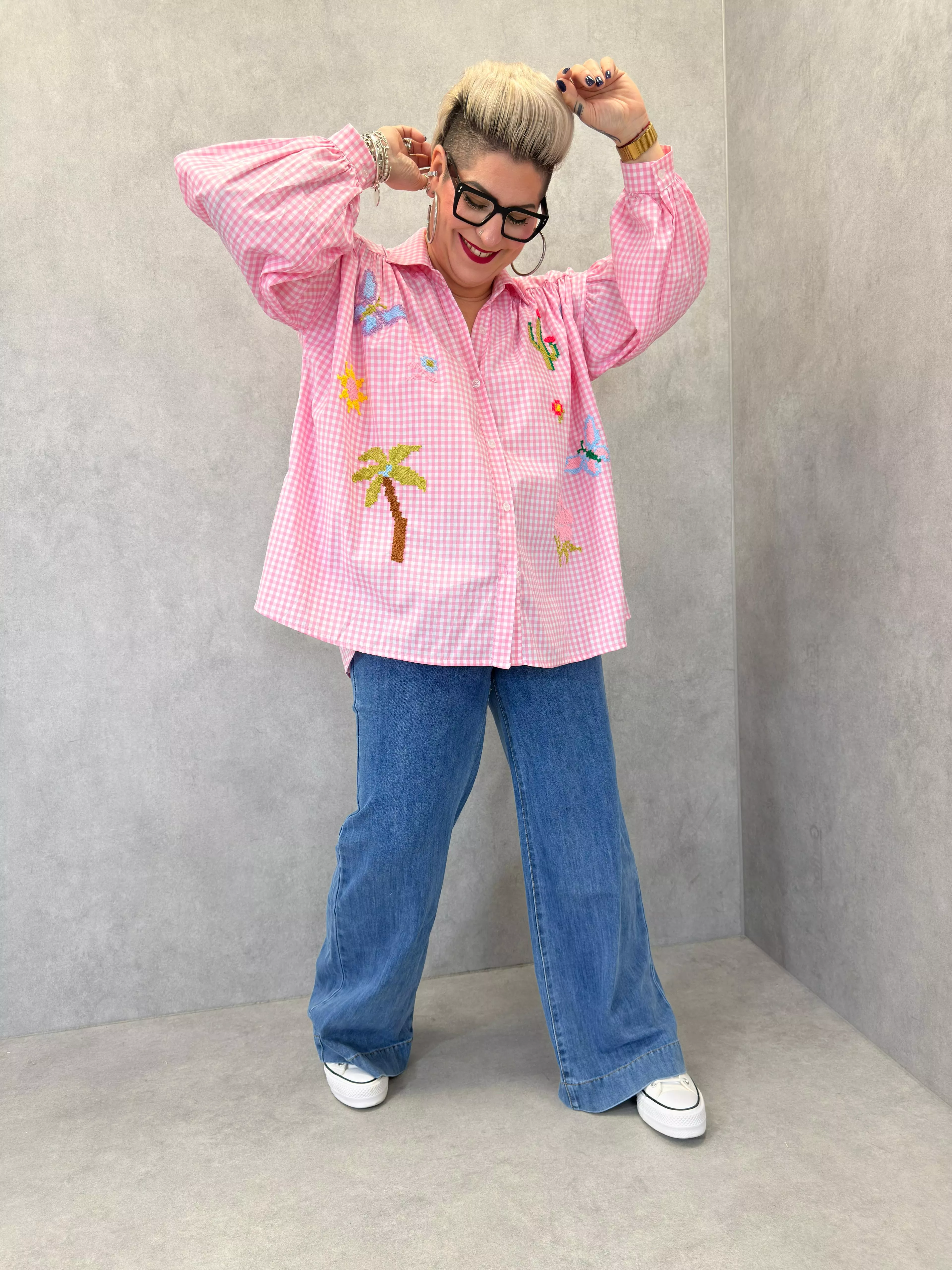Cette chemise se distingue par son motif Vichy classique revisité par des broderies contrastées : cactus, fleurs, palmier et petits motifs graphiques répartis sur le devant et les manches. Les broderies apportent du relief et un esprit ludique tout en conservant une base intemporelle.
