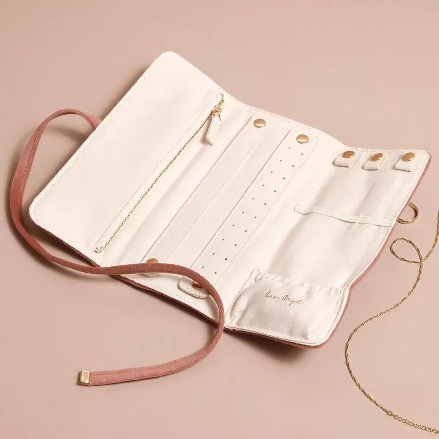 Son format roulé permet de maintenir les bijoux séparés et sans nœuds. L’ensemble rose poudré et crème est doux au toucher et très pratique pour les déplacements.