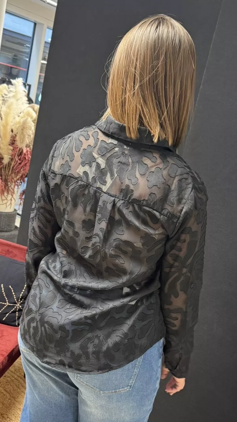 Die Bluse Sacha besticht durch ihren Stoff mit Burn-out-Effekt. Ärmel und Rücken spielen mit Transparenz, während die Vorderseite blickdicht gefüttert ist. Der Hemdkragen und der gerade Schnitt machen dieses Modell zu einem vielseitigen Teil, das sowohl elegant als auch lässig kombiniert werden kann.