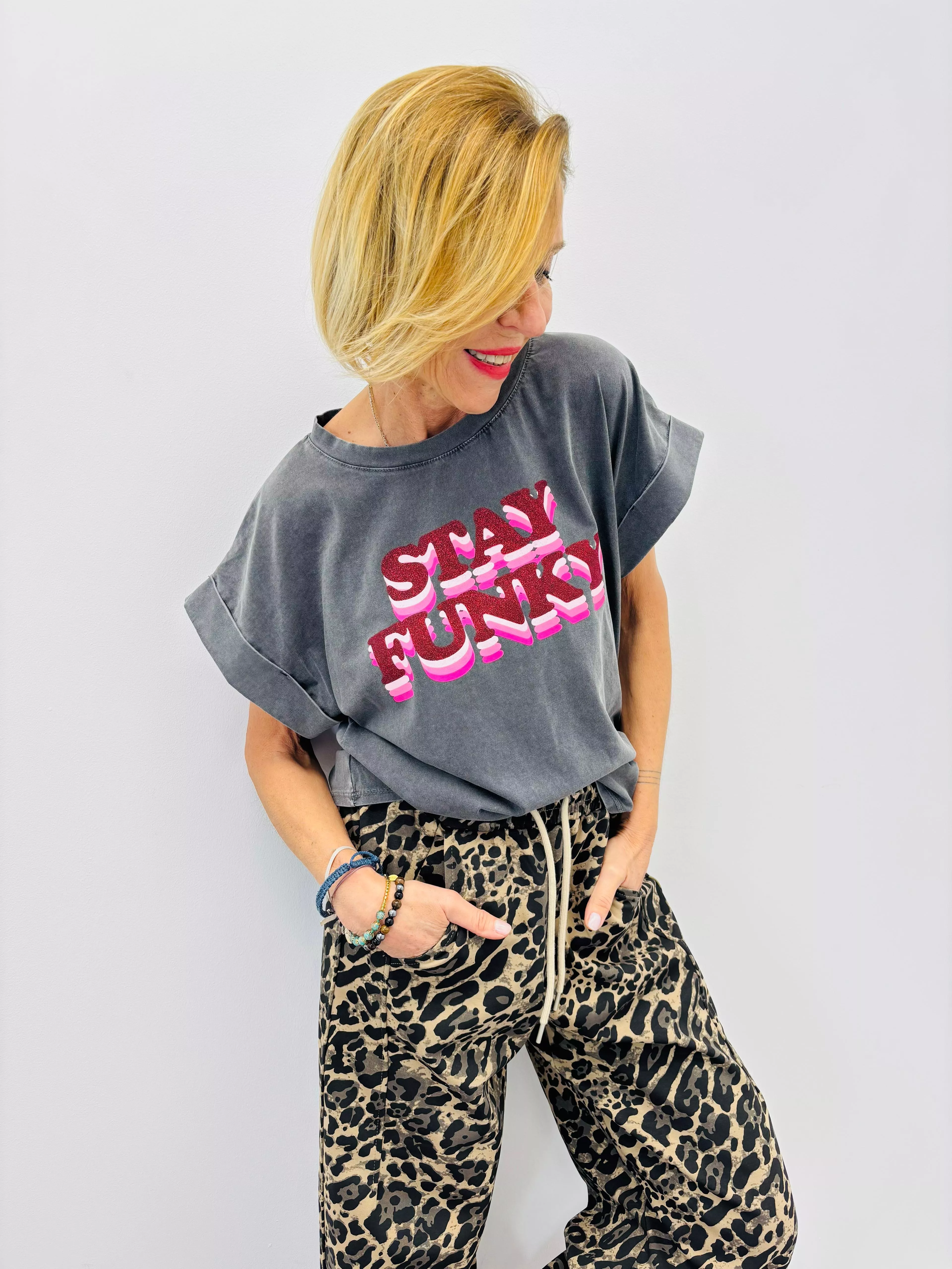 Ce modèle bénéficie d’un traitement garment wash qui lui donne un aspect légèrement délavé et un rendu unique. L’imprimé « Stay Funky » apporte une touche dynamique et contemporaine, facile à associer à un jean, un pantalon imprimé ou un modèle casual.