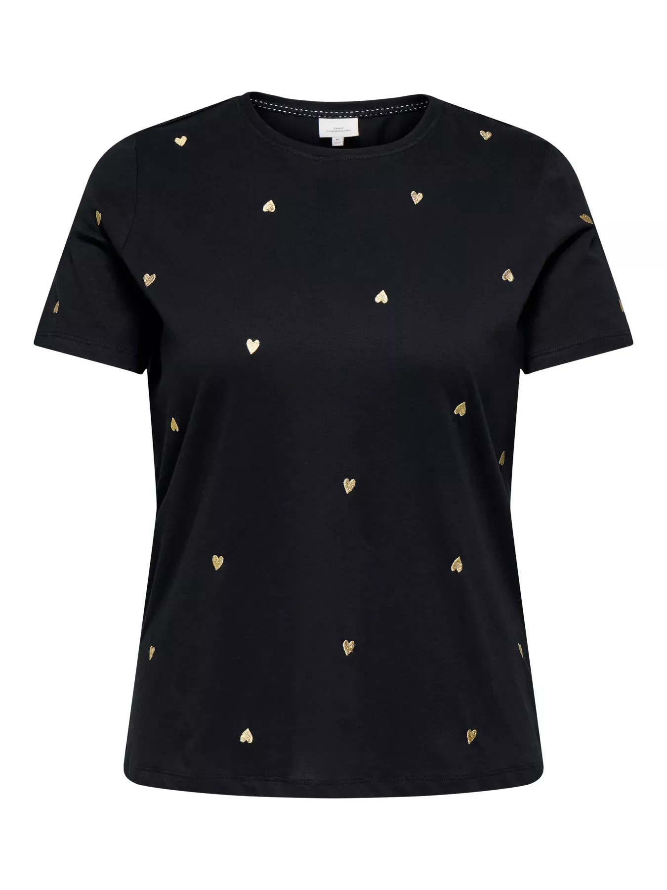 Un basique revisité qui attire le regard. Ce T-shirt signé Only Carmakoma séduit par ses petits cœurs brodés couleur or, disposés sur le devant. Sa coupe droite et son col rond en font une pièce facile à porter au quotidien, que ce soit avec un jean pour un look casual ou une jupe pour une allure plus féminine.