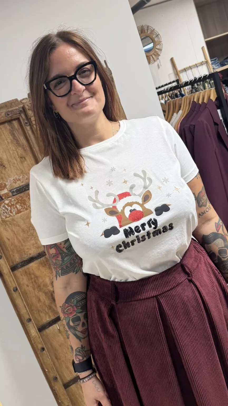 Sur fond blanc, le motif pailleté “Merry Christmas” s’accompagne d’un dessin de renne stylisé et de petits détails dorés, pour un esprit joyeux sans excès.