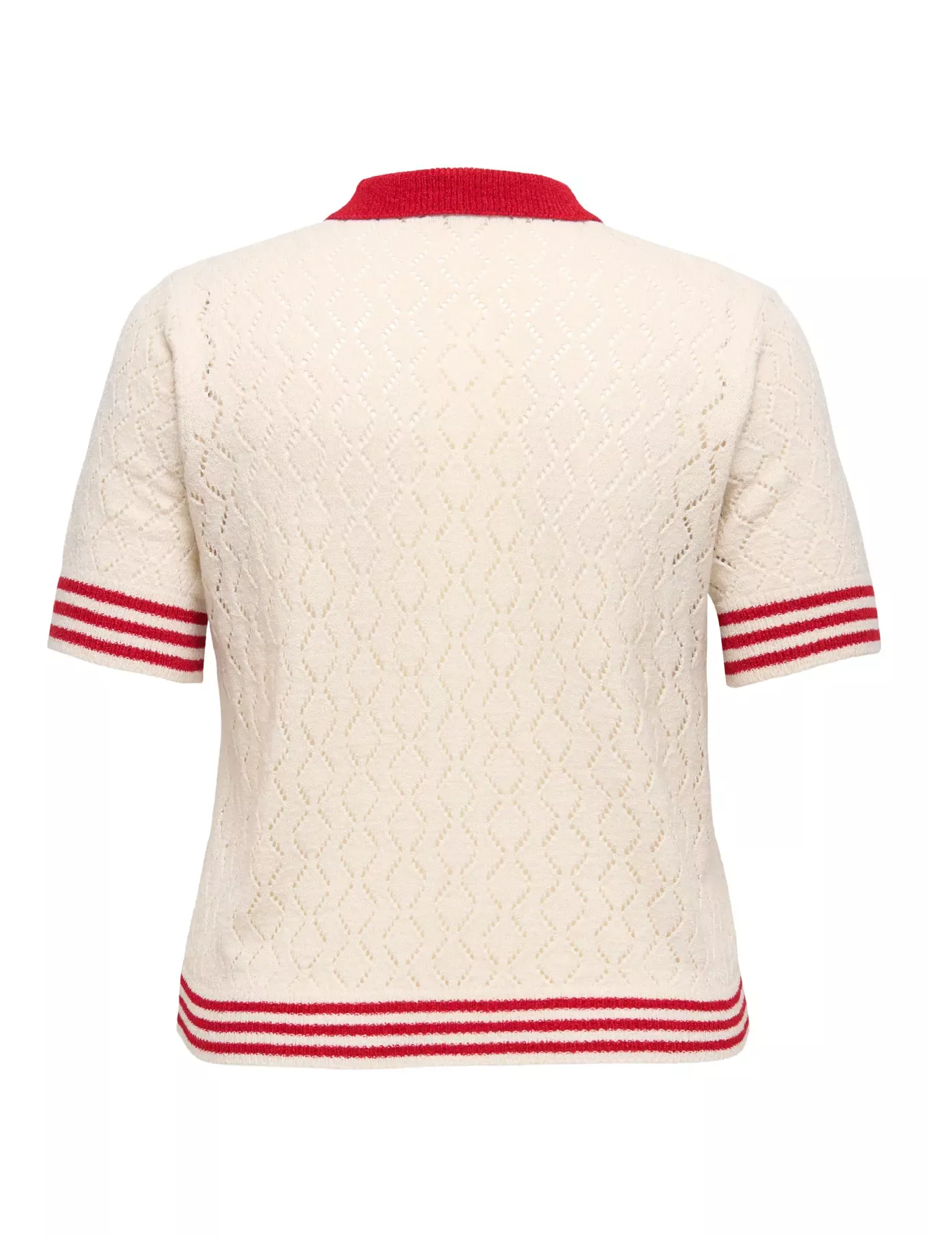 Polo Gabriel en maille ajourée chevron de Only Carmakoma, grande taille 42–54, disponible à Lausanne et en ligne. Une pièce au style tennis inspiré des années 80, pensée pour structurer la silhouette.