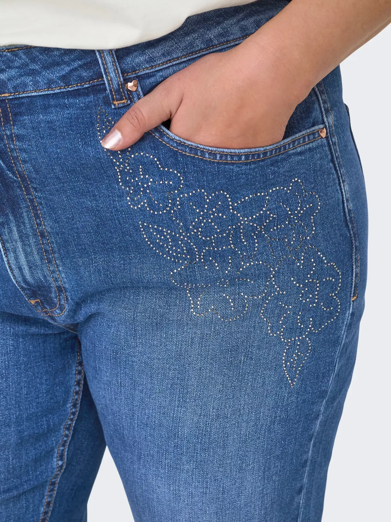 Le denim présente un délavage bleu classique facile à associer. Sur le devant, un motif floral en strass apporte une touche lumineuse et féminine tout en restant discret. Ce détail décoratif donne du caractère au jean sans le rendre difficile à porter au quotidien.