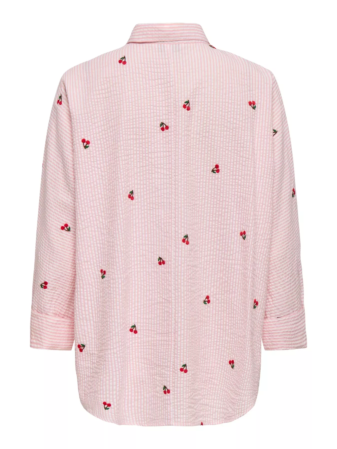 Cette chemise Only Carmakoma en grande taille, ornée de petites broderies cerises, apporte une touche fraîche et originale à une tenue estivale. Disponible dans notre concept store à Lausanne, elle se distingue par son tissu léger et son motif délicat.