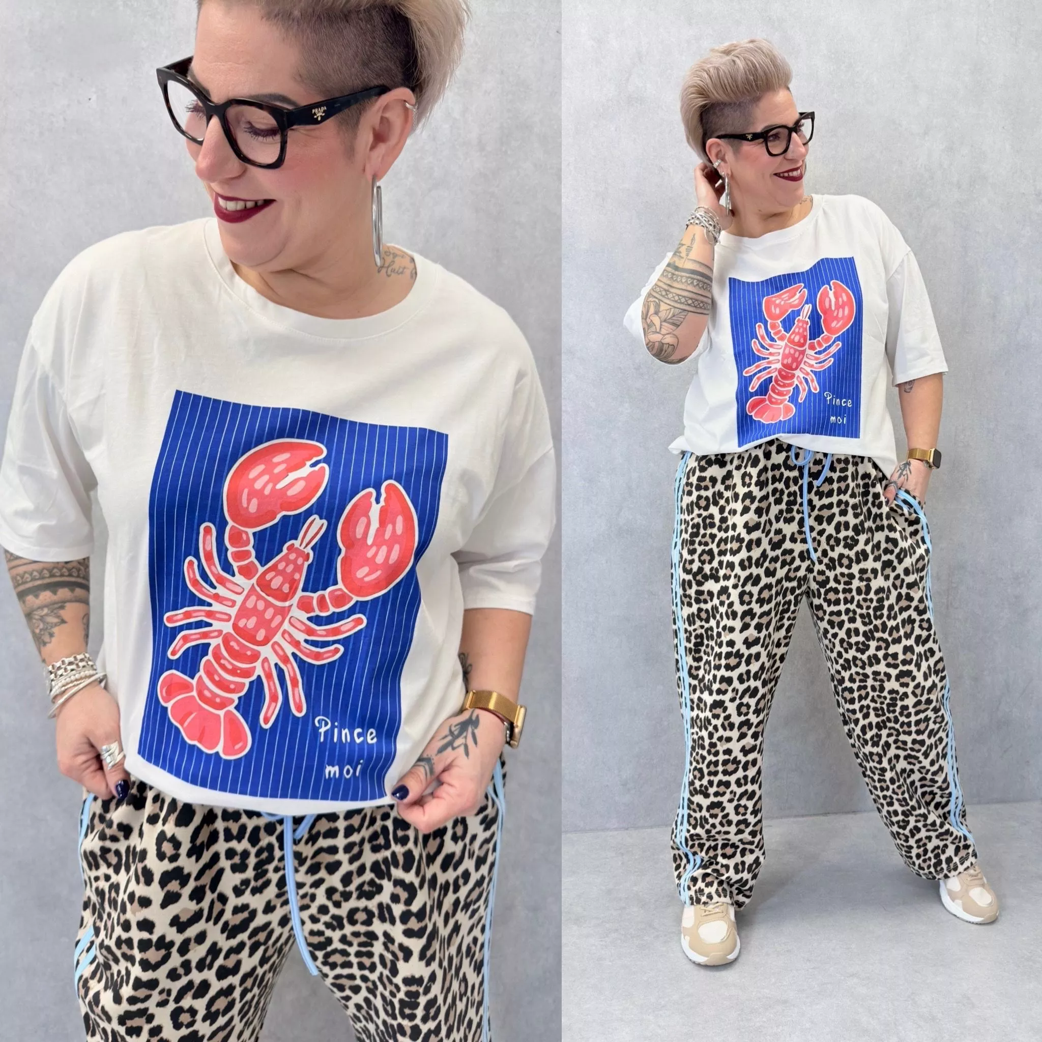 Ce t-shirt se distingue par son imprimé homard coloré sur fond graphique, apportant une touche décalée et moderne à une base simple. Sa coupe ample et droite est volontairement confortable, idéale pour les silhouettes grande taille qui recherchent de l’aisance sans contrainte.