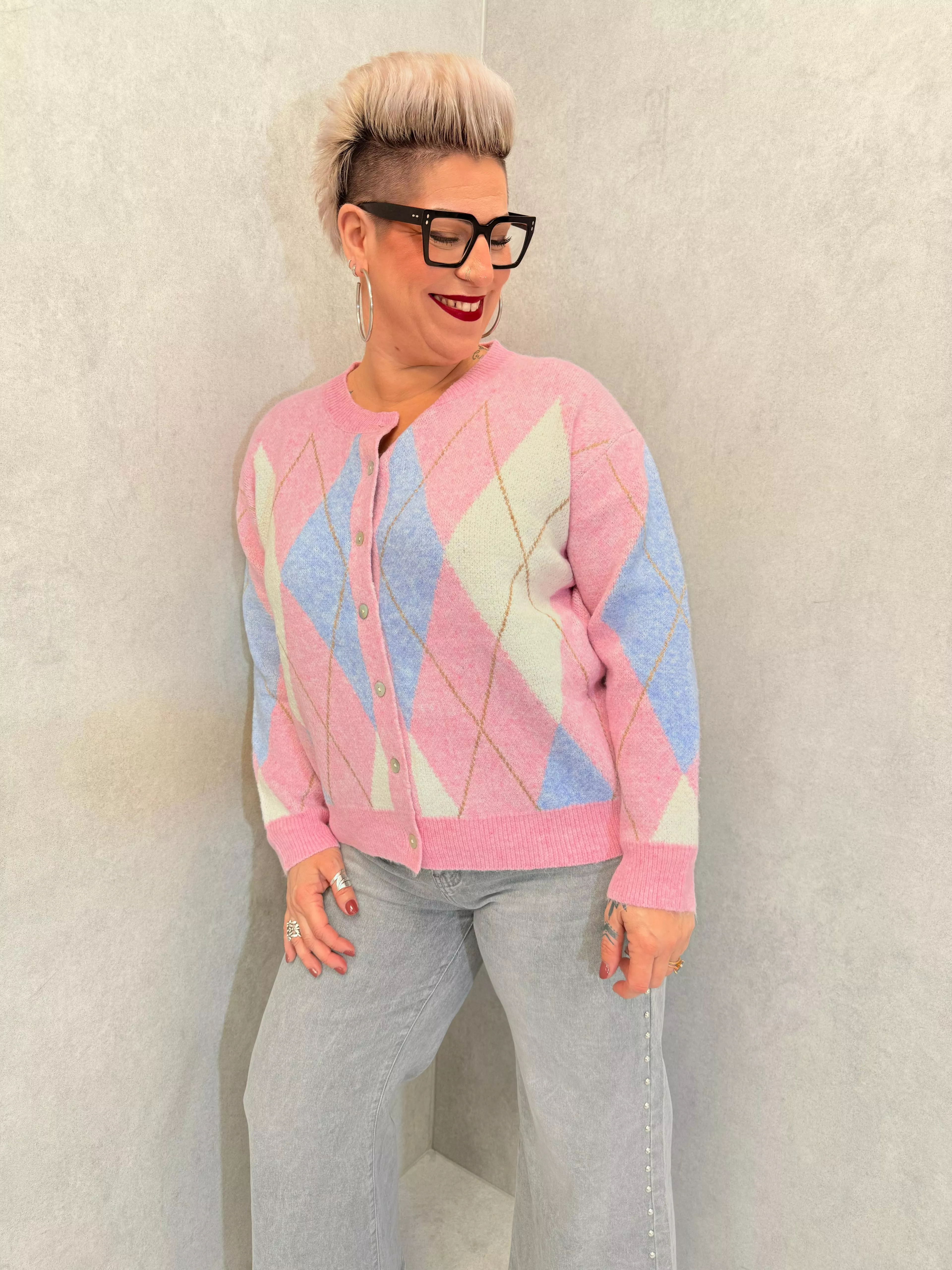 Ce gilet se distingue par son motif jacquard à losanges et son jeu de couleurs douces et contrastées. La fermeture boutonnée permet de le porter ouvert ou fermé selon l’allure souhaitée. Sa coupe est pensée pour les silhouettes grande taille, avec une bonne aisance au niveau du buste.