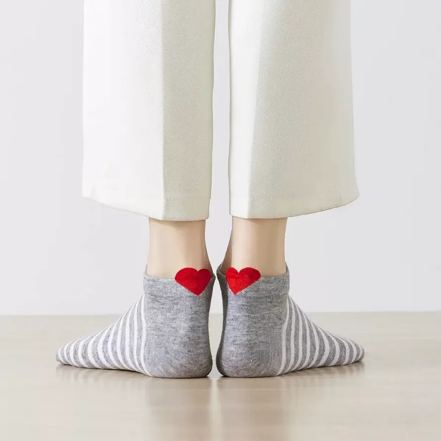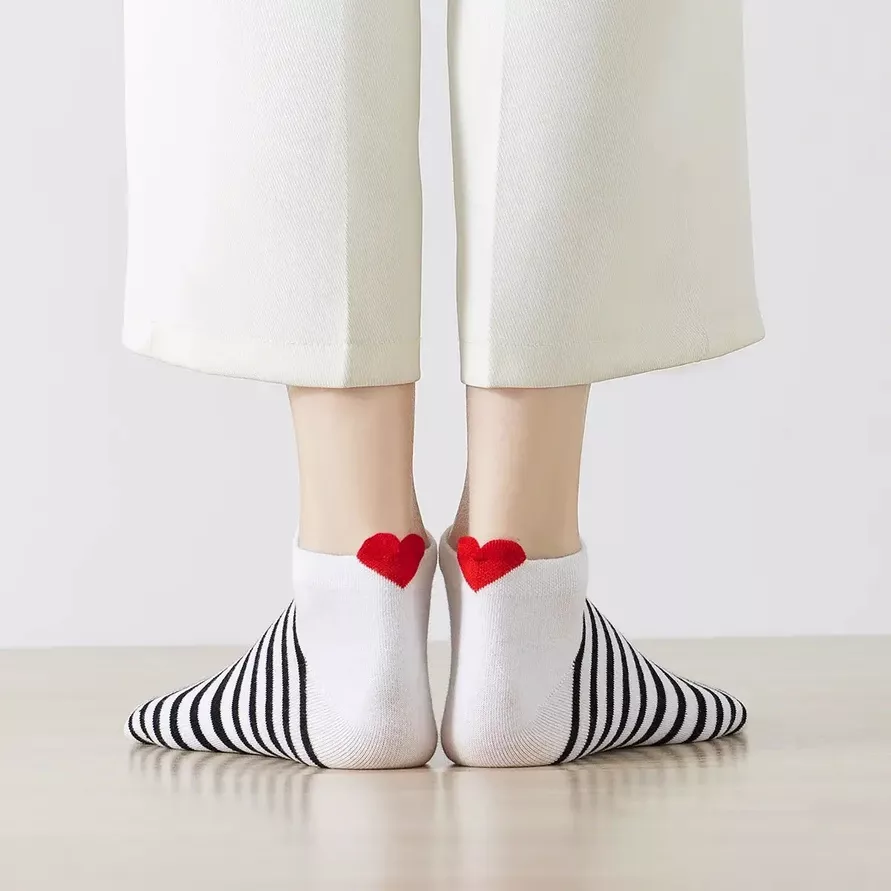 Ce lot comprend cinq paires de chaussettes fines à rayures, chacune dotée d’une languette au talon décorée d’un petit cœur brodé. Ce détail discret apporte une note graphique et romantique tout en restant facile à porter au quotidien.