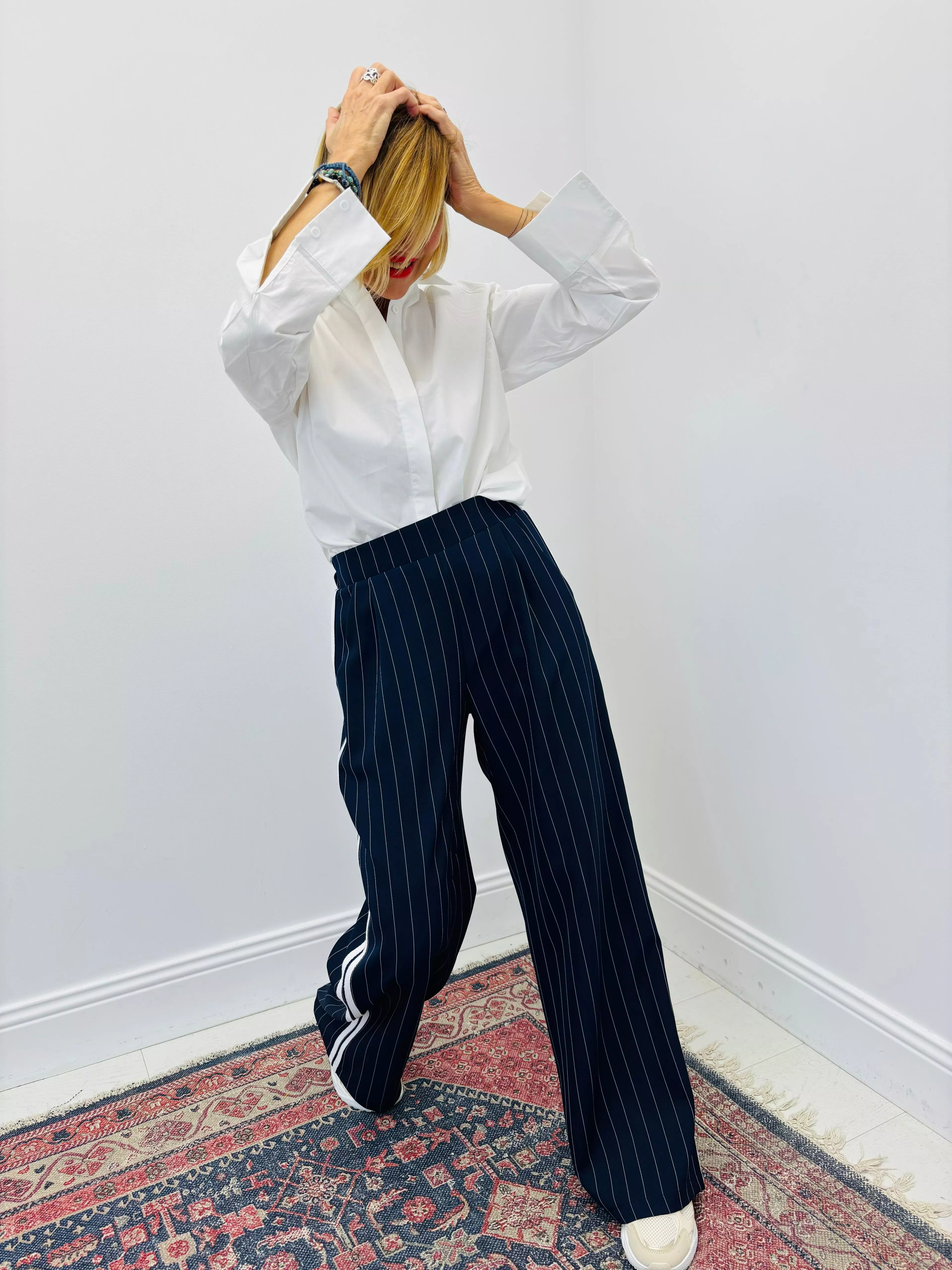 Pantalon Charming Girl bleu marine à rayures, disponible à Lausanne chez Caramel Beurre Salé Concept Store. Un modèle taille standard avec bandes latérales contrastées, pensé pour un look structuré et actuel.