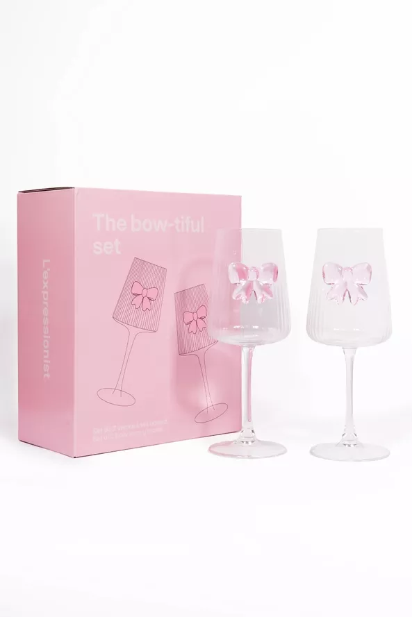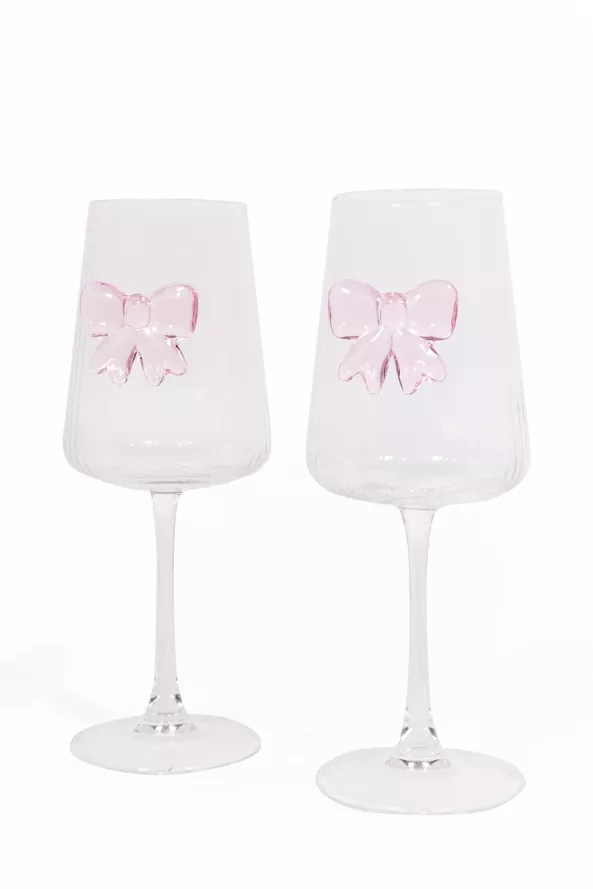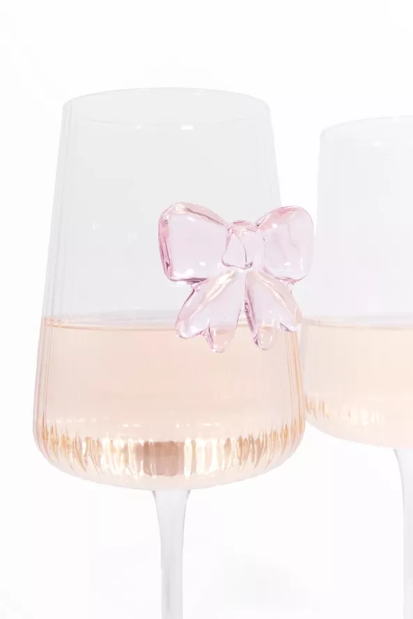 Jedes Glas ist mit einer rosafarbenen Schleife aus Glas verziert – ein feines, romantisches Detail, das modernen Stil mit einem Hauch Nostalgie verbindet.