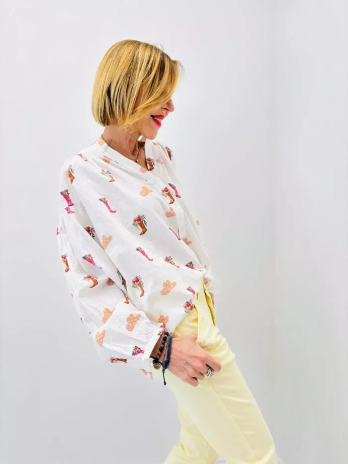 La chemise Johana de Maison Onado se distingue par une coupe bohème volontairement très large et courte. Réalisée en coton légèrement froissé, elle offre un volume assumé qui donne du caractère à la silhouette. L’encolure est ouverte, le tombé est souple, et les manches participent à ce jeu de proportions ample. Une pièce expressive, pensée pour un porté décontracté et affirmé.