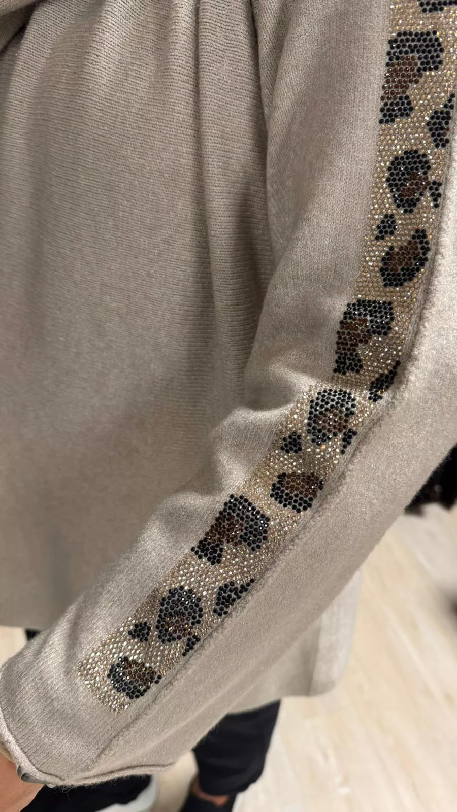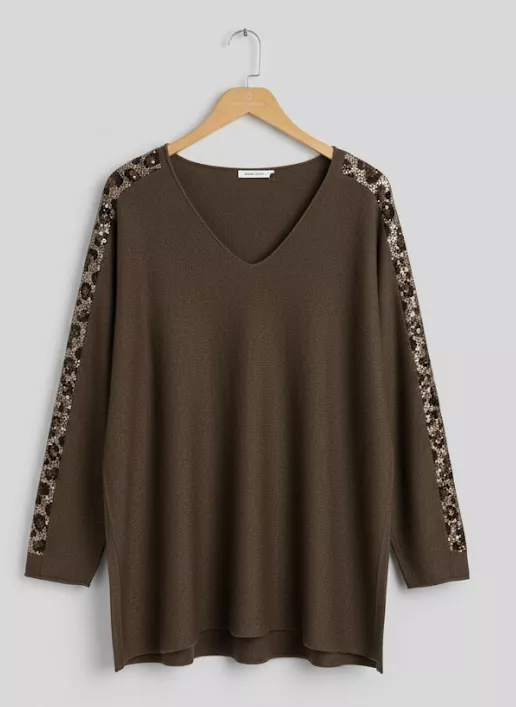 Ein weicher, fließender Pullover, perfekt für kurvige Silhouetten. Der lockere Schnitt und das angenehme Material sorgen für maximalen Komfort, ohne die Figur zu betonen. Die dezenten Strassdetails entlang der Ärmel verleihen dem Modell eine elegante, feminine Note – ideal für den Alltag oder einen entspannten Abend.