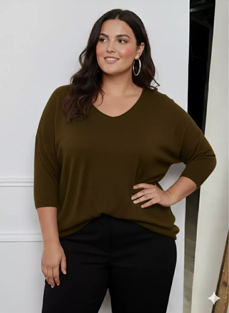 Les manches 3/4 apportent une touche moderne et féminine, légèrement plus courtes sur les silhouettes plus généreuses.