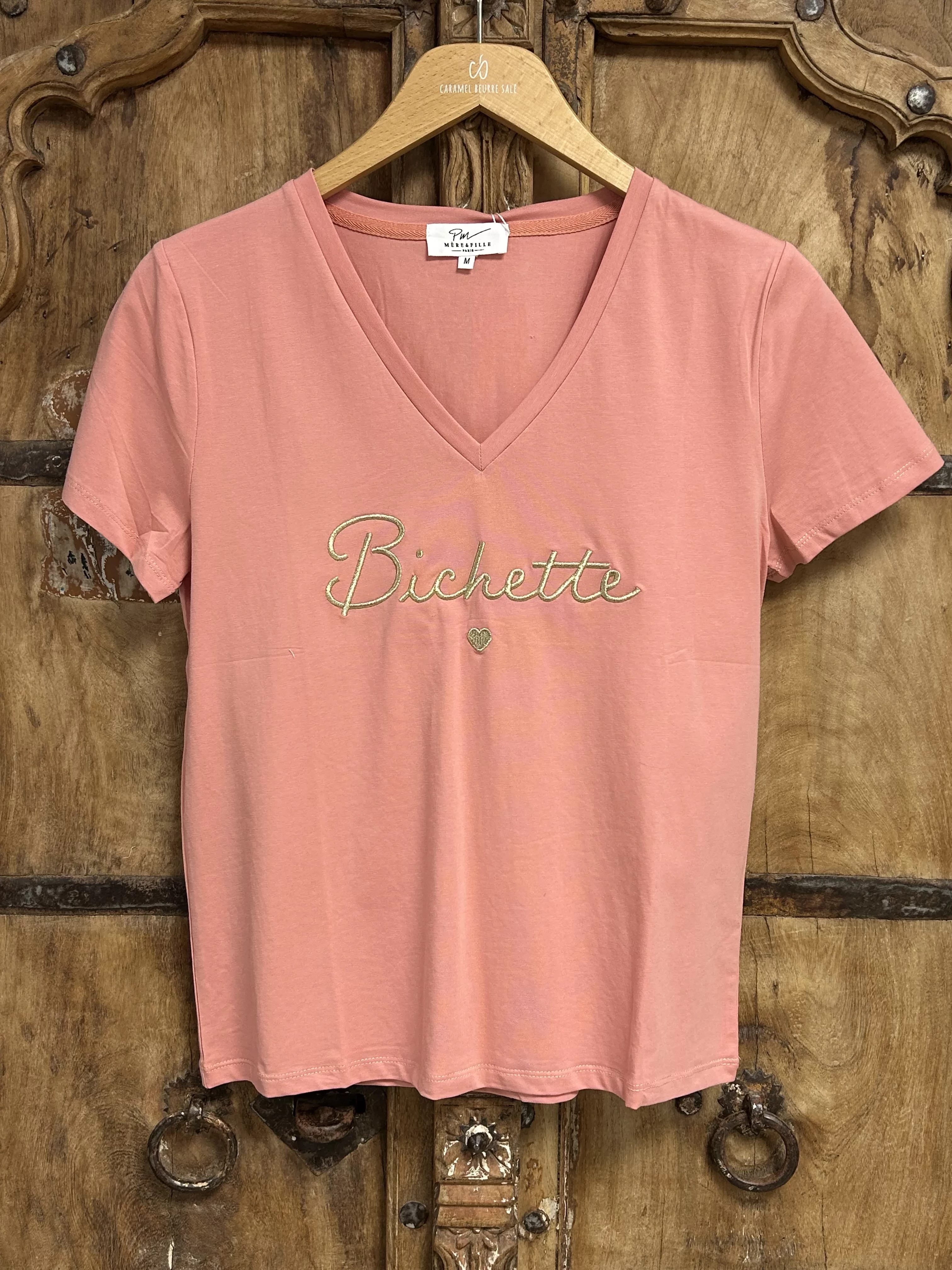 Ce joli t-shirt en coton stretch est un essentiel du dressing. Avec son col V flatteur et sa broderie dorée "Bichette", il apporte une touche élégante et décontractée. Son tissu doux et confortable en fait une pièce agréable à porter au quotidien.