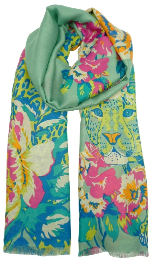 Ein farbenfroher Schal mit Dschungelmotiv – ein echtes Highlight-Accessoire. Tropische Blüten kombiniert mit dem Blick eines wilden Leoparden machen dieses Design einzigartig. Mit seiner leuchtenden Farbpalette verleiht er jedem Outfit sofort mehr Energie.