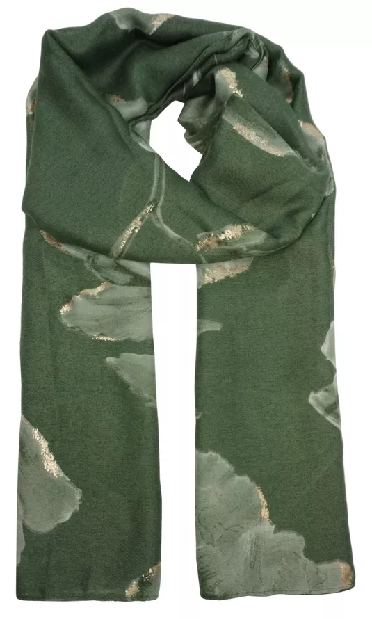 Ein eleganter Schal mit großem Blumenmotiv und goldfarbenen Akzenten, die für einen raffinierten, leuchtenden Effekt sorgen. Erhältlich in mehreren Farben (Rot, Grün oder Schwarz), passt er sowohl zu Alltagslooks als auch zu festlicheren Outfits. Leicht und fließend – perfekt für die Übergangszeit.